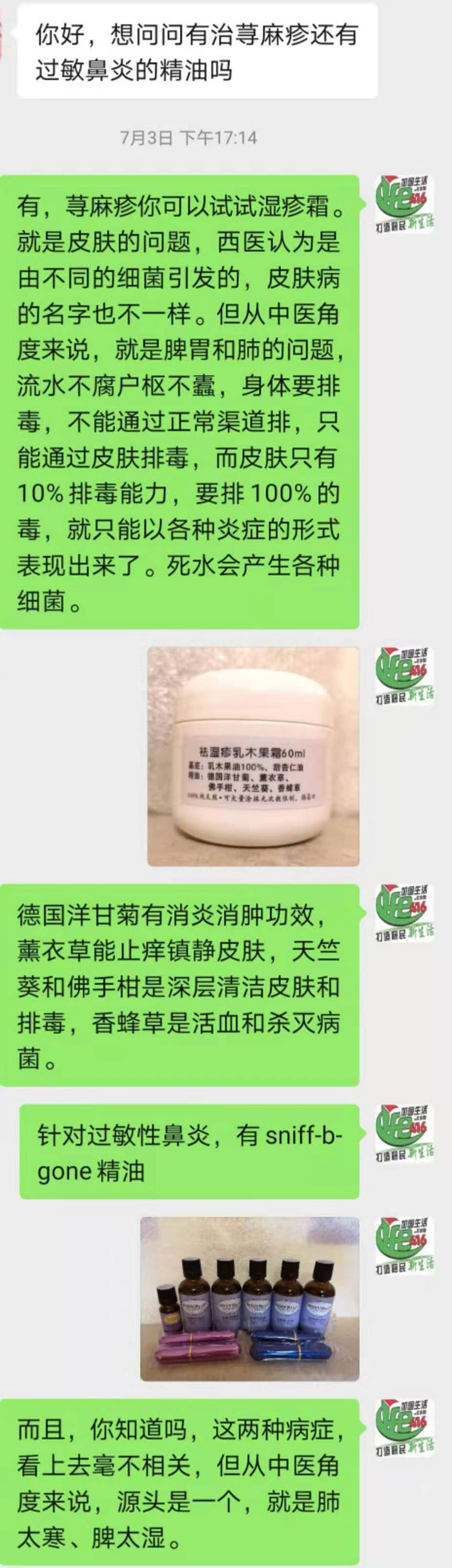 【加国生活网】这段时间找我订湿疹霜的朋友猛增,基本都是朋友推荐朋友来的。最近一位朋友问针对鼻炎和荨麻疹精油是否有好办法?精油还真有靠谱的办法,那就是使用湿疹霜和鼻炎精油,我又加了一句:其实湿疹和鼻炎的源头是同一个。朋友也加了一句:是荨麻疹,不是湿疹哟。