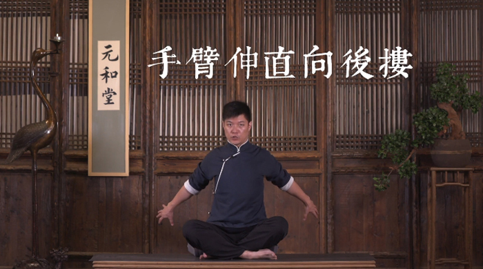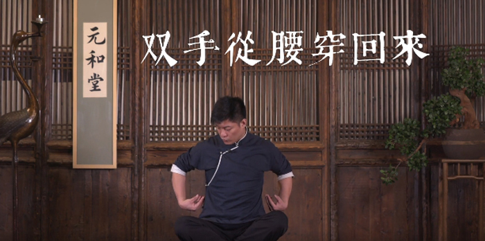 4、呼气曲肘,双手内旋,经腰两侧旋回向前伸展。如此反复练习20-30遍。