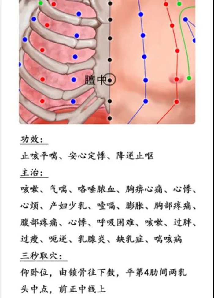 膻中穴快速取穴法:仰卧位,由锁骨往下数,平第4肋间,身体前正中线上,两乳头连线中点处即是。