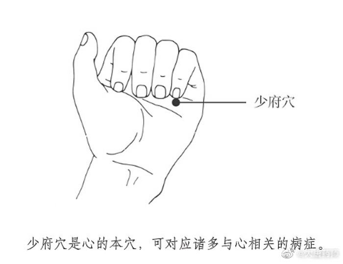 4、少府穴:是手少阴心经的穴位之一,位于手掌面,第4、5掌骨之间,握拳时,当小指尖处。取穴时仰掌,手指屈向掌心横纹,当小指指尖下凹陷处是穴。