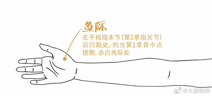 作用:清宣肺气,清热利咽,止咳。此穴为肺经荥穴,五行属性属火。“荥主身热”,故此穴具有清肺泻火,清宣肺气的作用。同时,这个穴位对积食也有好处。