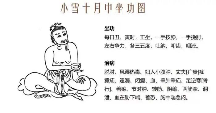 坐功:每日丑、寅时,正坐,一手按膝,一手攀肘,左右争力,各三五度。叩齿,吐纳,咽液。日常保健可不拘泥于上述练功时间。