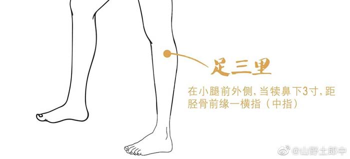 方法:这个穴位在外膝眼下三寸的地方,按摩时,用食指、中指并拢一起来按揉即可,顺时针与逆时针交替按200~300次。