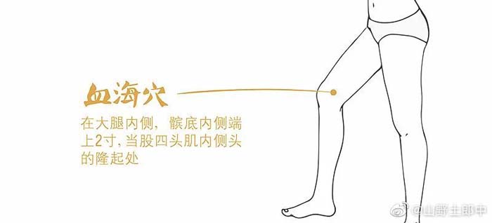 血海穴是人体脾血的归聚之处,具有祛瘀血和生新血的功能,能调血、理血、引血。血海擅调妇科血病,是治疗妇科病症、皮肤病的要穴。