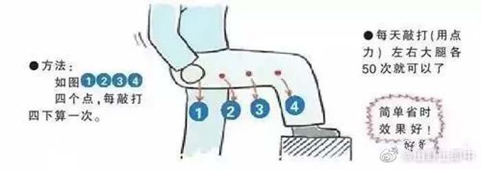 如图每天在大腿外侧的四个穴位点,用力敲打,每敲打四下算一次,每天敲左右大腿各五十次,也就是左右各两百下。
