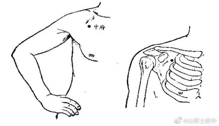 取穴:胸前壁的外上方,云门穴下1寸,前正中线旁开6寸,平第2肋间隙处。正坐或仰卧,将右手三指(食、中、无名指)并拢,放在胸窝上,中指指腹所在的锁骨外端下即是。