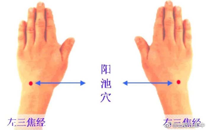 阳池穴在手背腕横纹的中央点上,按压的方法可以自行选择,但最好两手交替按压,各以一手中指在另一手的穴位上。
