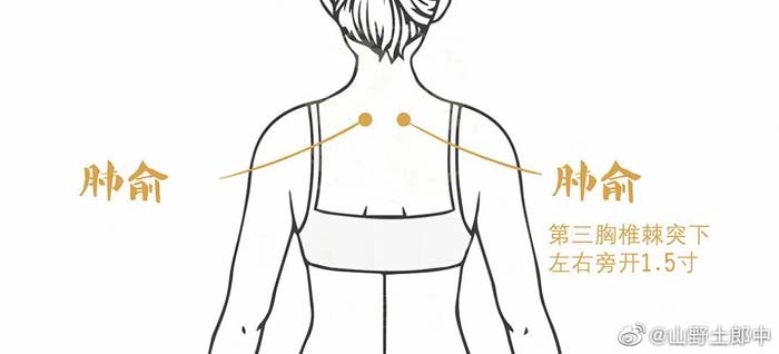 肺俞穴在背部两个肩胛骨内上角,平行于第3胸椎棘突下,在脊柱2指旁边的位置。如果自己不方便按揉肺俞穴,可以用按棒来轻轻按揉。