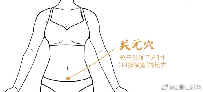 关元穴在肚脐下3寸,即1手掌的宽度。一般来说,女性的小腹部都有较厚的脂肪,内部的子宫也有较强的抗外力的结构。