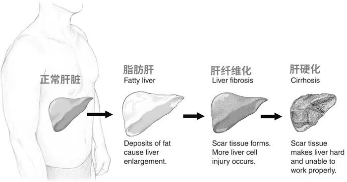 正常肝脏→脂肪肝→肝纤维化→肝硬化