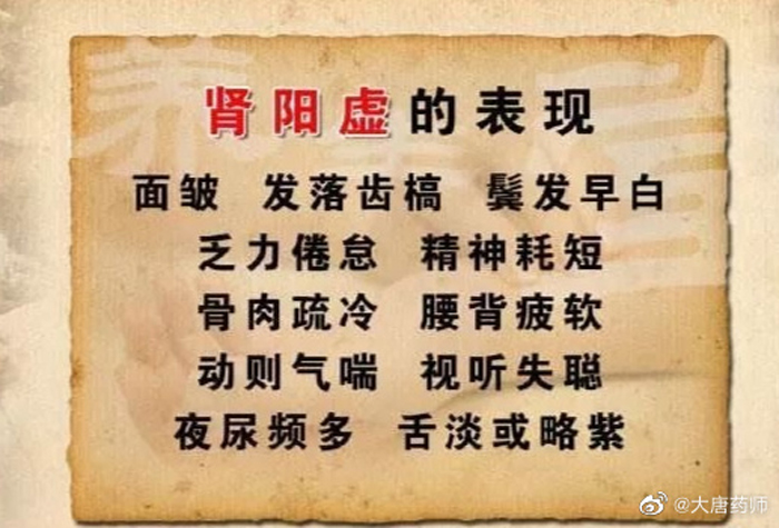 中医认为“阳虚生外寒”,因此肾阳虚多表现为怕冷,常常表现为面色苍白、手脚冰凉、精神不振、容易疲劳、失眠健忘、腰膝酸软、夜尿频多等。