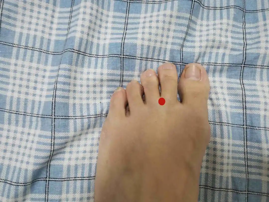 刺激内庭穴,我们可以按摩,也可以针刺(有点儿疼)。平时在家没事的时候可以用手指按压内庭穴,按压的时候,用拇指的指尖按住内庭,稍微用点力按压,有酸胀感更好。双侧的内庭穴都要按压。