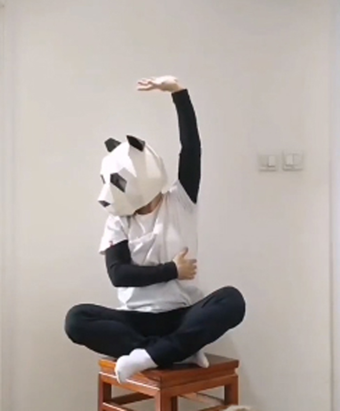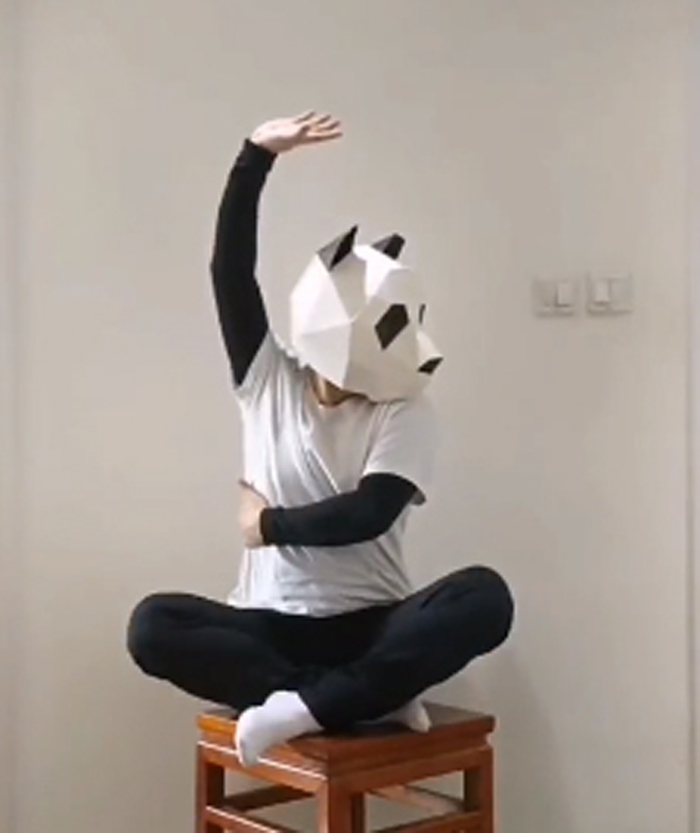 3、落右臂,升左臂,在胸前交叉同时头颈转正。然后变为右手掌抚左肋,左掌托天,手指平展向右,头颈转向右侧平视。如此往复。