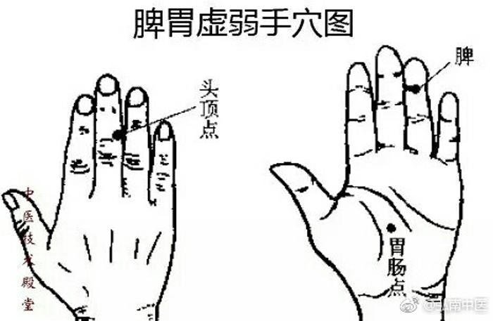 此法是周尔晋先生的方法,适用于脾胃虚弱的人,分别是在手穴上的头顶点、脾点、胃肠点用手指或者火柴棒或者牙签圆头按压7分钟;