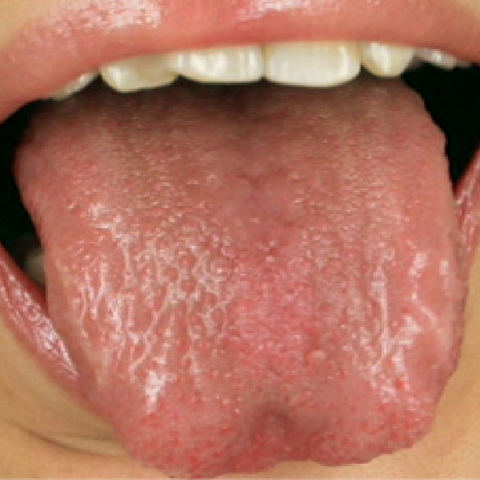 第一,当某种情况下舌苔脱落,或者舌苔出现空隙,此时我们可以看到舌正面的舌质;