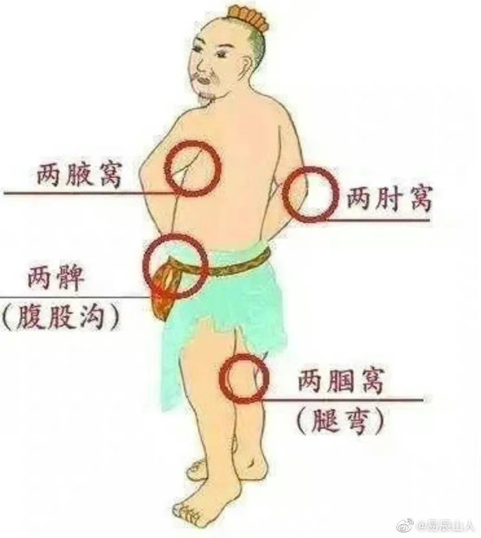 人体有八个大窝窝又称八虚,它们是双腋、双肘、双髀(即两胯)和双腘。八虚也是寒冷冬天人体最暖和的地方。据说这八虚小到治感冒大到治疑难杂症,是道家不外传的秘诀。