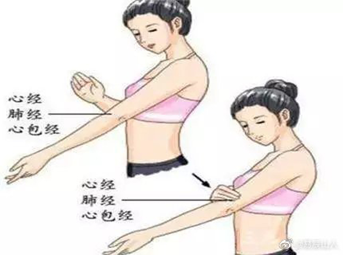 肘窝部位,刚好是心经、心包经、肺经三条阴经通过的地方,还藏着两个穴位,肺经的尺泽穴和心包经的曲泽穴。
