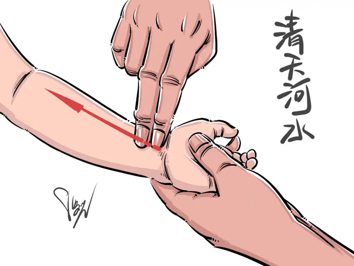 清天河水,家长一只手握住宝宝的左手部,另一只手的食、中两指面,从孩子的腕横纹推到肘横纹,自下向上做直推法。