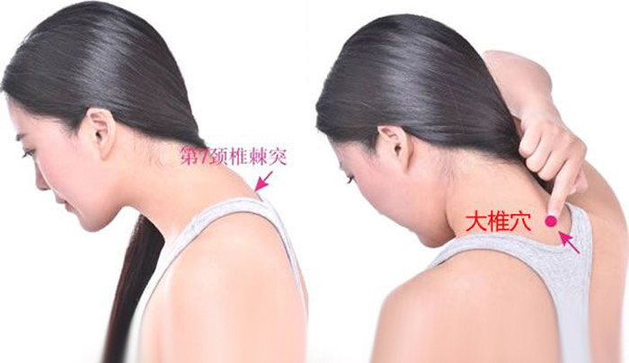 首先,我们看大椎穴在哪。我们低头的时候,会看到后脖子最高起来的一块骨头,就是大椎穴,实际上在这位置附近都可以。