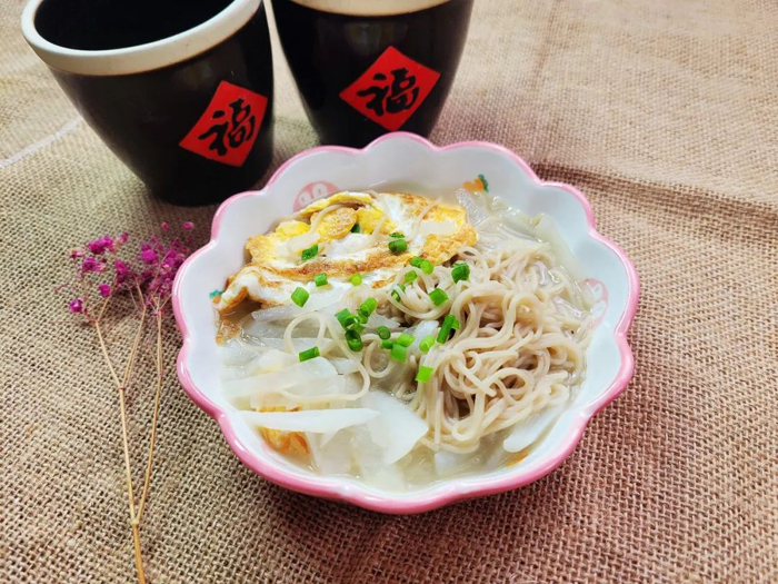 白萝卜半根、鸡蛋2个、运谷八珍面2袋、葱花、盐、胡椒粉。