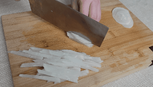 1、白萝卜去皮,切成细丝,放入锅中小火炒软,然后盛出备用;