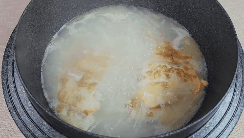 3、倒入适量开水,再放入炒软的萝卜丝,小火焖煮15分钟;(注意一定要是开水,这是汤色变奶白的关键)
