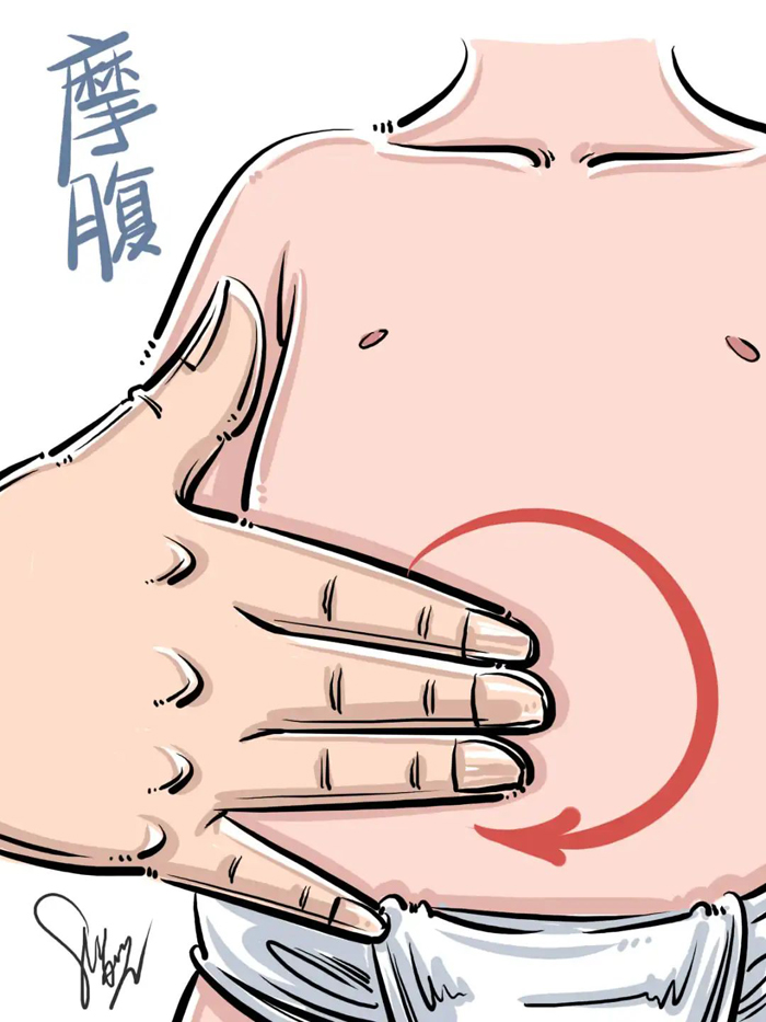 摩腹,就是摩擦腹部;小宝宝躺在床上,家长用手掌面按顺时针或者逆时针方向摩腹。根据不同需要选择不同方向。顺时针有消食导滞,通便作用;逆时针有健脾止泻之功。(下图示的摩腹为顺时针摩腹,相反的方向摩腹则是逆时针摩腹。)