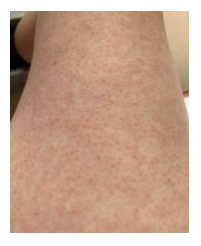 自述照片不足以反映真实状态,真实的情况看上去挺吓人的,腿部的红疹一直到脚踝,胳膊一直到腋窝。去医院,医生判断是病毒疹,意思是可能感染了某种病毒,出的疹子。也没有什么治疗方法,开了开瑞坦,服用无效。