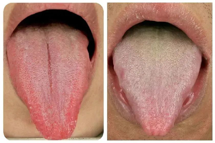 还有一种非常典型的舌象,非常多的一大类,这个是没人分析,我总结出来的,相当多的人舌头形状是尖尖的。我们知道正常舌头是椭圆形的,这舌头一伸出来是尖尖的,意味着肝气不舒、气机郁结。这种情况有一大类人精神压力比较大、焦虑等等。他肝气郁结,平时这样人气血流通不畅,郁结。