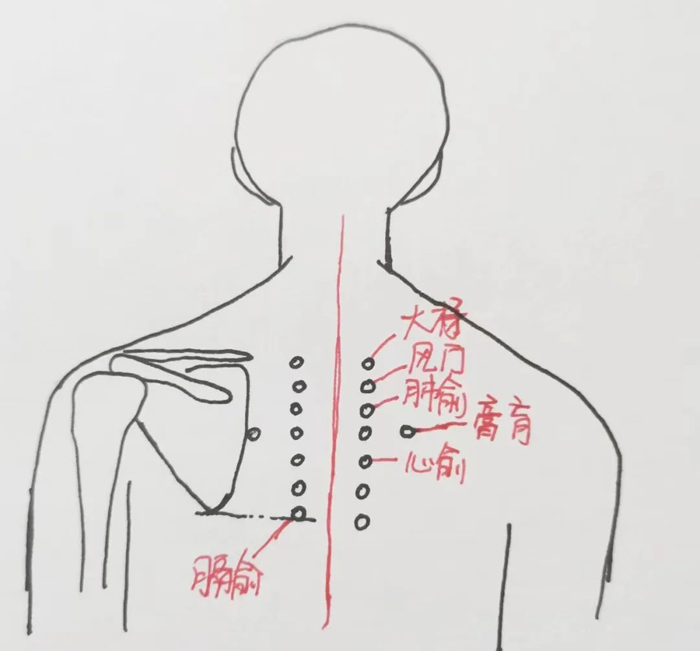 天突穴为任脉与督脉交会穴,具有宣肺化痰,利咽开音之功。肺俞穴为太阳膀胱经腧穴,能解表通络,宣肺止咳,主治肺脏疾病的重要穴位,肺俞还可以促进肺脏的恢复。风门穴宣肺止咳,祛风解表。