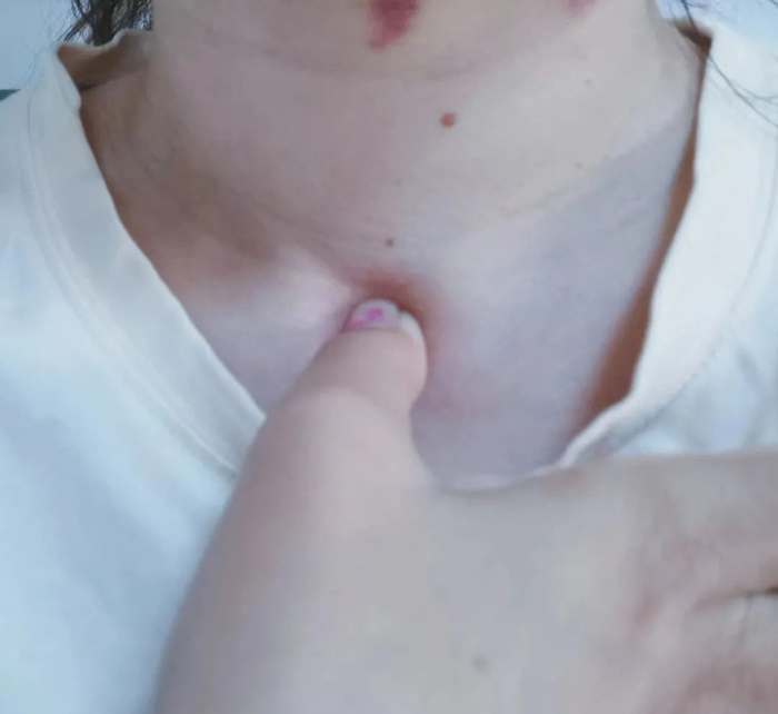 天突穴,在颈部,胸骨上窝中央。很好找,在脖子前面,