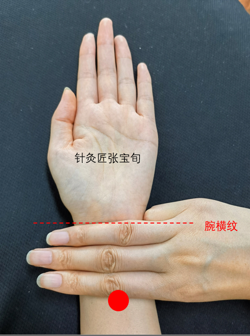快速取穴方法:前臂掌侧,手腕横纹向上,手三指并排处,握拳屈腕时可见的凹陷中。