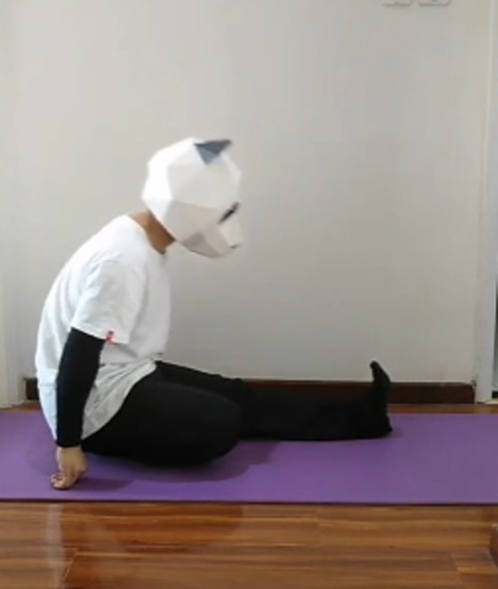 双腿交换姿态,伸右腿展直,足尖回勾,上身前倾以腹去贴右腿之大腿面,如此往复。