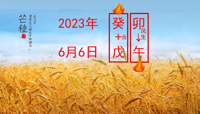加国生活网小编最新爆料:2023年6月6日进入芒种节气,同时也进入“戊午”月,天干为“戊”、地支为“午”。与此同时,2023年是癸卯年,天干是“癸”、地支是“卯”。从天干来看,月份天干“戊”和年份天干“癸”刚好形成天干五合即“戊癸合火”,即天上形成一股火的能量场。从地支来看,年份地支“卯”属木,月份地支“午”属火,木能生火,即地上又有一股火的能量场,而且木又是风,火借风势会越烧越旺。