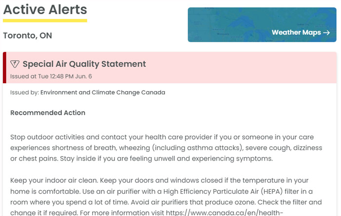 事实也是如此,2023年6月6日的多伦多弥漫着浓浓的烟气,魁北克省的山火所产生的烟雾已经借着风势吹到了多伦多,加拿大环境部也在当天发布空气质量警告,建议住在安省的居民减少户外活动。详情请点击这里