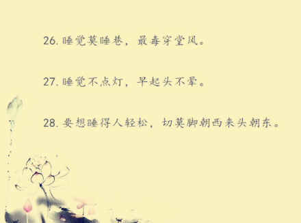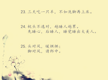 加国生活网小编编后案:这个老祖宗留下的28条经验在微博和微信上发布后,有好多粉针对第25条:“头对风,暖烘烘;脚对风,请郎中。”有些质疑,难道“头对风”也是养生?其实这句话是相对于脚部保暖来说的,脚一定要注意保暖御寒,不能对吹风,而头部则要适当地保持寒冷。头部过度保暖,不仅没有好处,还可能会引起上火头晕、头脑浑浊等病症;脚部则需要特别的保暖,稍微着凉,就可能引发感冒、支气管炎等疾病。所以常年看光着脚的人士一定要注意了,特别是在家里光着脚站在凉地上或者睡觉时脚露在外面对着窗口吹风。