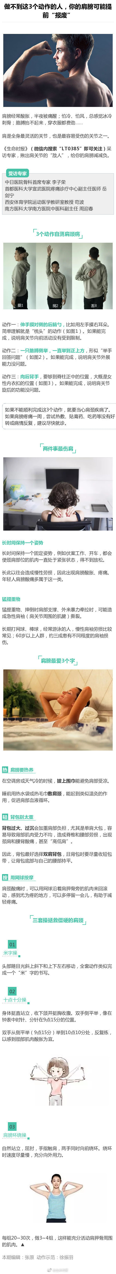 有些人经常肩膀酸胀,半夜痛醒;怕冷、怕风;胳膊抬不起来,穿衣服都费劲……肩是身体最容易受伤的关节之一。生命君为你示范3个动作,一分钟帮你自测肩颈病,并附上实用的养肩指南。