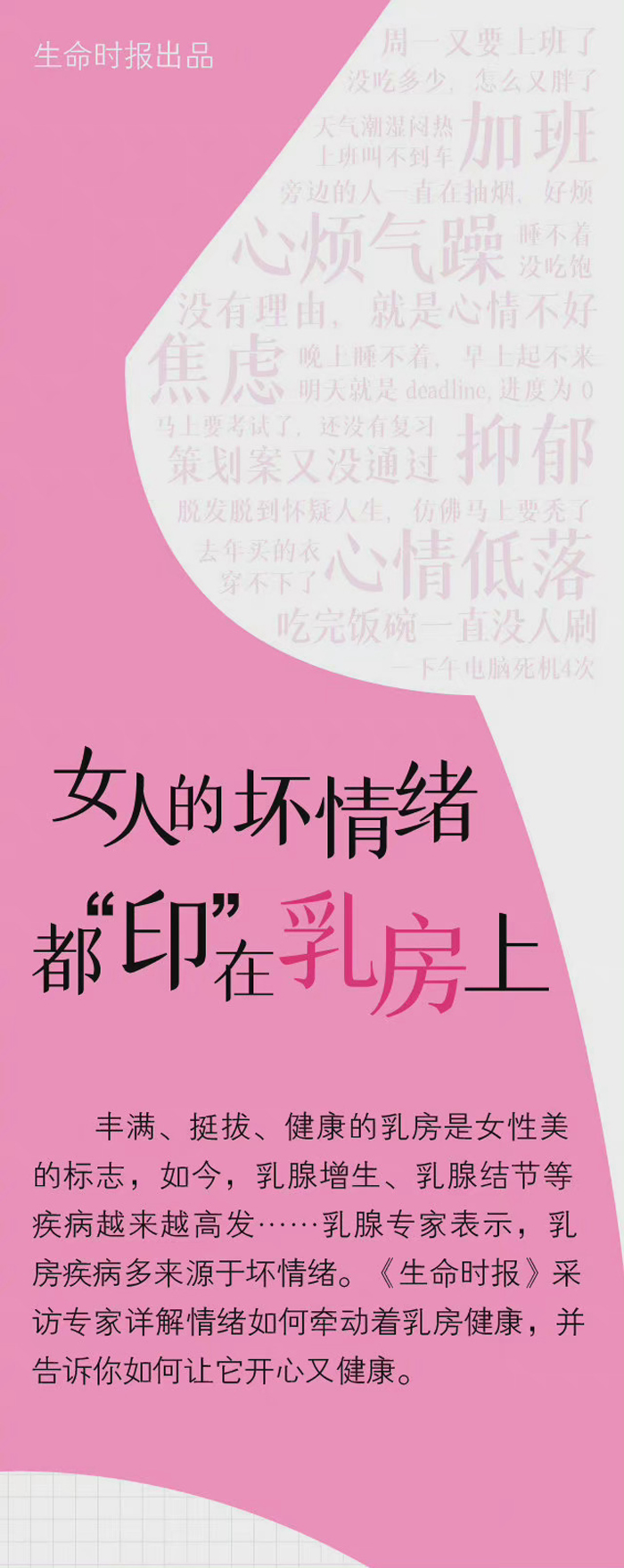体检报告里,乳腺增生、乳腺结节、乳腺纤维瘤等疾病十分常见。我国每年乳腺癌新发病例约30万人。很多爱生气的女性可能不知道,你的一次动怒就可能让乳房承受巨大伤害。情绪是如何牵动乳房健康的?乳腺科医生教你一表测出乳腺健康。