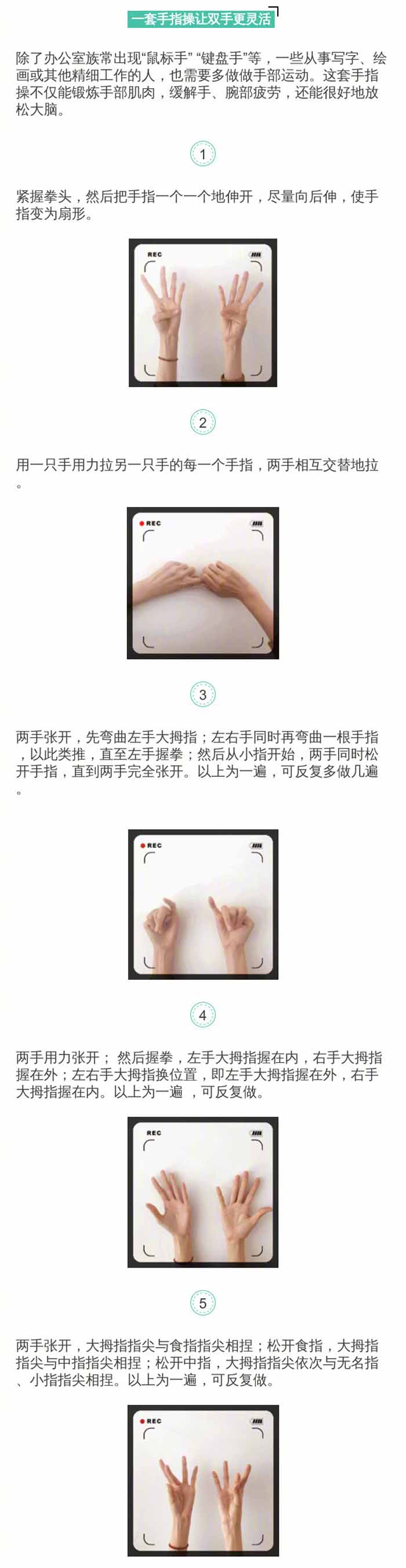 手是人的“第二张脸”,一双白嫩的手可以给人加分不少。经常做手部按摩,可以调节脏腑功能,还能起到美容的作用。推荐一套手部保健操,简单易学,不仅能锻炼手部肌肉,缓解手、腕部疲劳,还能很好地放松大脑。快伸开你的五指,跟着动起来吧!
