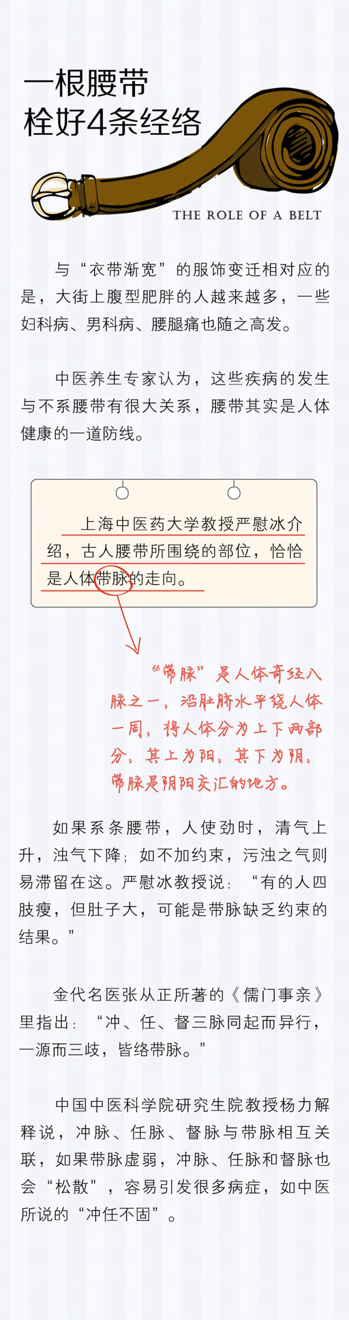 随着A字裙、松紧裤以及各类宽松服饰的流行,腰带似乎被打入冷宫:很多服装不需要腰带,有腰带也是作为装饰使用。不系腰带,腰上没了束缚,似乎舒服了、省事了,却可能有损健康。《生命时报》采访专家,给你一个重新爱上腰带的理由。