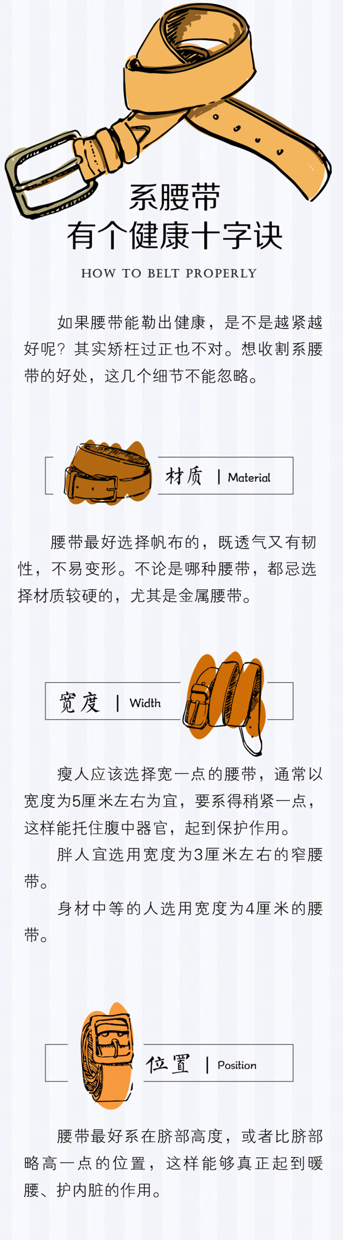随着A字裙、松紧裤以及各类宽松服饰的流行,腰带似乎被打入冷宫:很多服装不需要腰带,有腰带也是作为装饰使用。不系腰带,腰上没了束缚,似乎舒服了、省事了,却可能有损健康。《生命时报》采访专家,给你一个重新爱上腰带的理由。
