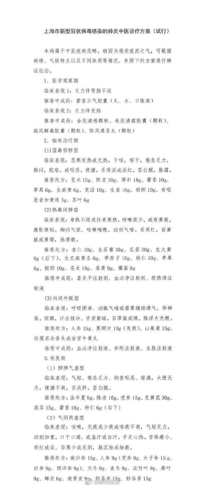 中医药治疗新冠肺炎患者# 截至1月29日,上海新型冠状病毒肺炎定点医院已有41例确诊患者同时应用了中医药治疗,其中14例正在服用中药汤药。80多岁的吴银根是非典时期上海第一位进入非典病房的中医。他认为,相比非典,新型冠状病毒的牵涉面大,但是病人严重程度没有非典重。上海老中医们根据病人类型开出了不同的方子。疑似病人有专门的方案,基本用的中成药,例如连花清瘟胶囊等。对于确诊病人,上海也制定了具体方案。
