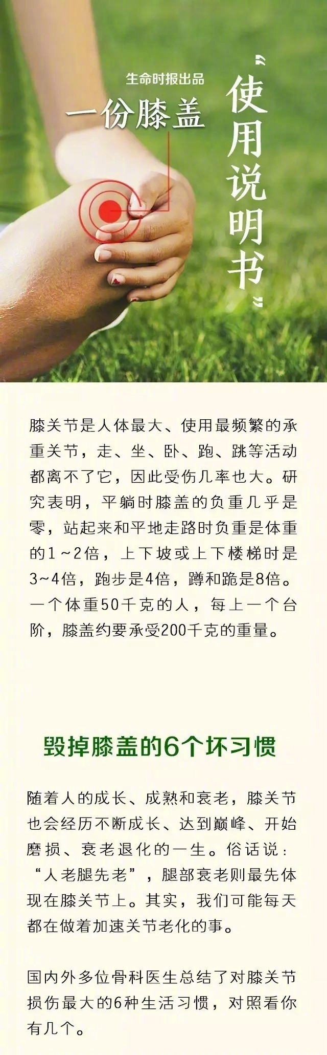 膝关节是人体最大、使用最频繁的承重关节,走、坐、卧、跑、跳等活动都离不了它,因此受伤几率也大。一个体重50千克的人,每上一个台阶,膝盖约要承受200千克的重量。