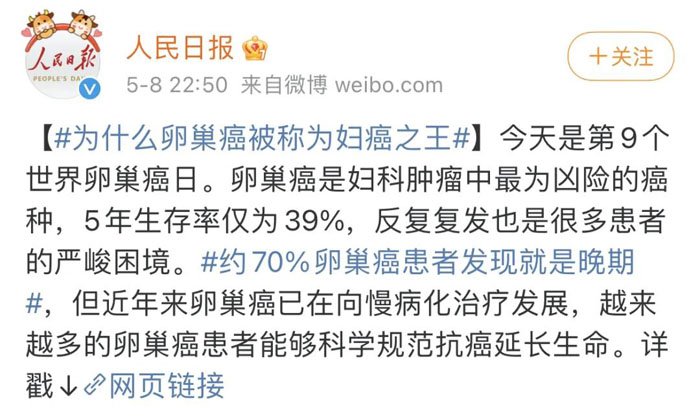 2021年5月8日,是第九个「世界卵巢癌日」,它由世界卵巢癌联盟发起,旨在分享抗癌知识、提高公众对卵巢癌的认识。