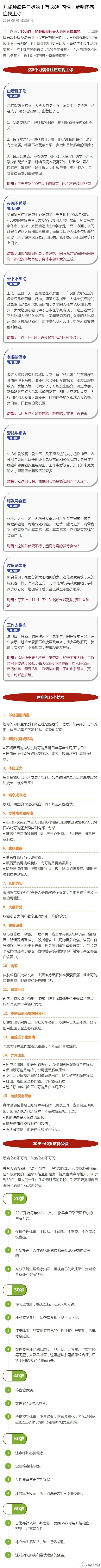 90%以上的肿瘤是后天人为因素造成的。”诱发肿瘤多与不良生活方式有关。约1/3与吸烟有关,1/3与饮食有关,1/3与感染和环境污染有关,仅1% ~3%的肿瘤跟遗传有关。8个习惯让癌症找上你,癌症的15个信号,这些你都需要知道。