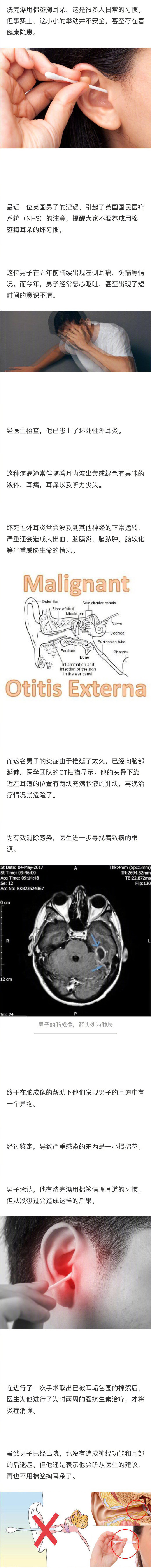 英国男子因用棉签掏耳朵 患上了坏死性外耳炎 为此NHS严肃提醒民众:没事儿真别瞎掏耳朵