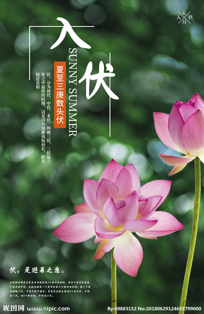 “三伏(Dog Day)”是初伏、中伏和末伏的统称,是一年中最热的时节。每年出现在阳历7月中旬到8月中旬。其气候特点是气温高、气压低、湿度大、风速小。“伏”表示阴气受阳气所迫藏伏地下。按我国阴历(农历)气候规律,前人早有规定:“夏至后第三个庚日开始为头伏(初伏),10天后是第四个庚日为中伏(二伏),如果第五个庚日在立秋之前,那么中伏就需20天,俗称两个中伏;若在立秋之后,中伏就是10天;立秋后的第一个庚日叫末伏。以后就出伏了,随着日照时间缩短,天气也一天比一天凉爽了。“三伏”不属于24节气之一。