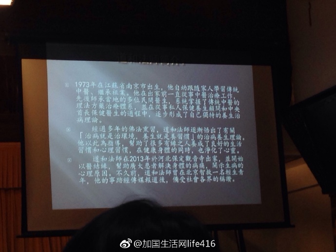小编最新爆料:小编4月4日下午2点去听了在中华寺举办的中医讲座,受益非浅。来自江苏的僧医名家“道和法师”的“养生就养阳气、治病就是治环境”的理论小编很赞同,大家一方面胡吃海塞地吃各种食物,一方面又得各种疾病四处求医。养阳气其实就是养生活习惯、治环境其实治疗身体的内部环境。加拿大特别冷,这种冷很容易让身体有湿的,特别是容易饮食不当造成脾胃湿寒。4月5日下午2-4点道和法师会讲中老年人的养生之法,感兴趣的不妨去听听。