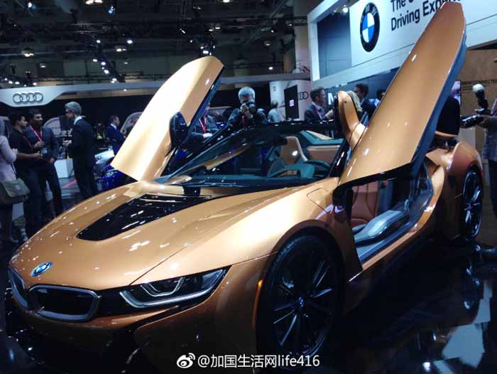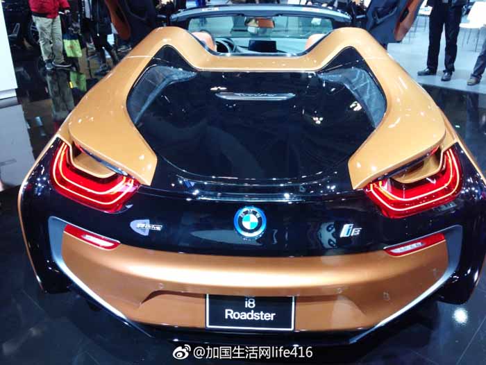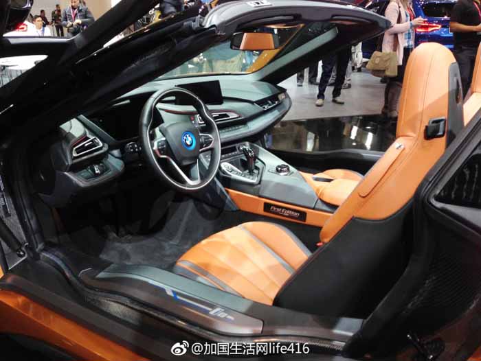 2019年BMW i8 Roadster敞篷跑车是该品牌混合动力超级跑车的首款版本(金色的哎,真漂亮)。与轿跑车一样,i8敞篷跑车采用1.5升三缸发动机与电动马达和9.4千瓦时锂离子电池相连。总功率输出额定功率为369马力,可以在4.6秒内将全轮驱动i8跑车从零开始提速至100公里/小时。i8跑车在其底盘和车身面板上广泛使用CFRP和铝。随着该款敞篷跑车在车展的推出意为着该款跑车将于春季发售。