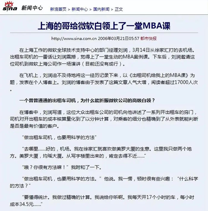 18年前,一篇《出租司机给我上的MBA课》火遍全网,你还记得吗?作者刘润当时在微软做管理,一次偶然的打车经历,他遇到一位出租车司机,一路上的闲聊让刘润感觉仿佛上了一堂MBA课。